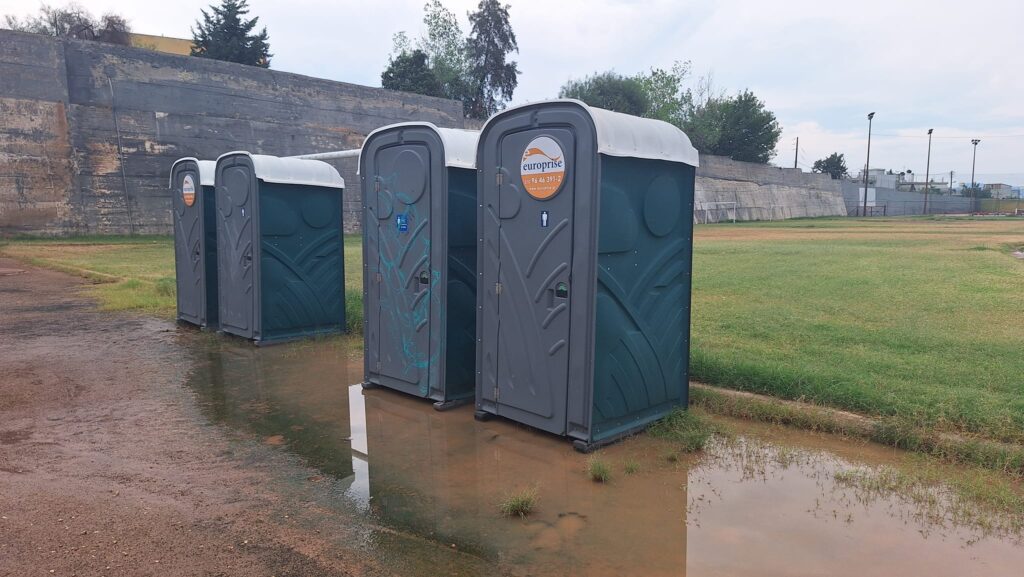 Απέναντι στην κερκίδα των φιλοξενούμενων τα ίδια οσο αφορά κυρίως την ασφάλεια των θεατών.Κυλικείο δεν λειτουργεί ,νερό δεν είχαν να πάρουν οι θεατές, και το κυριότερο οι τουαλέτες κλειστές για μην μιλήσουμε για τουαλέτες ΑΜΕΑ.